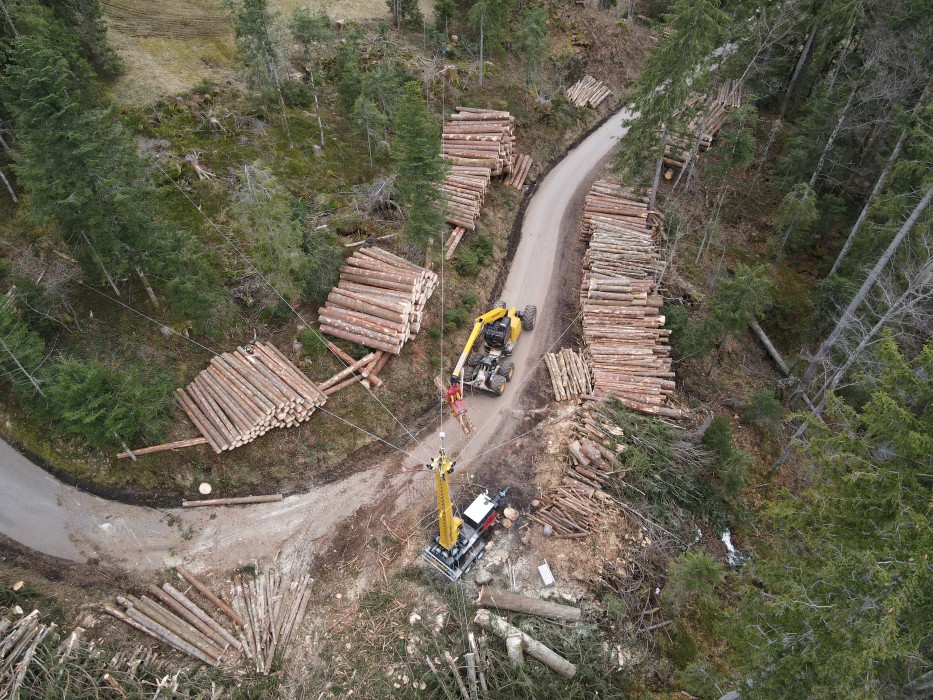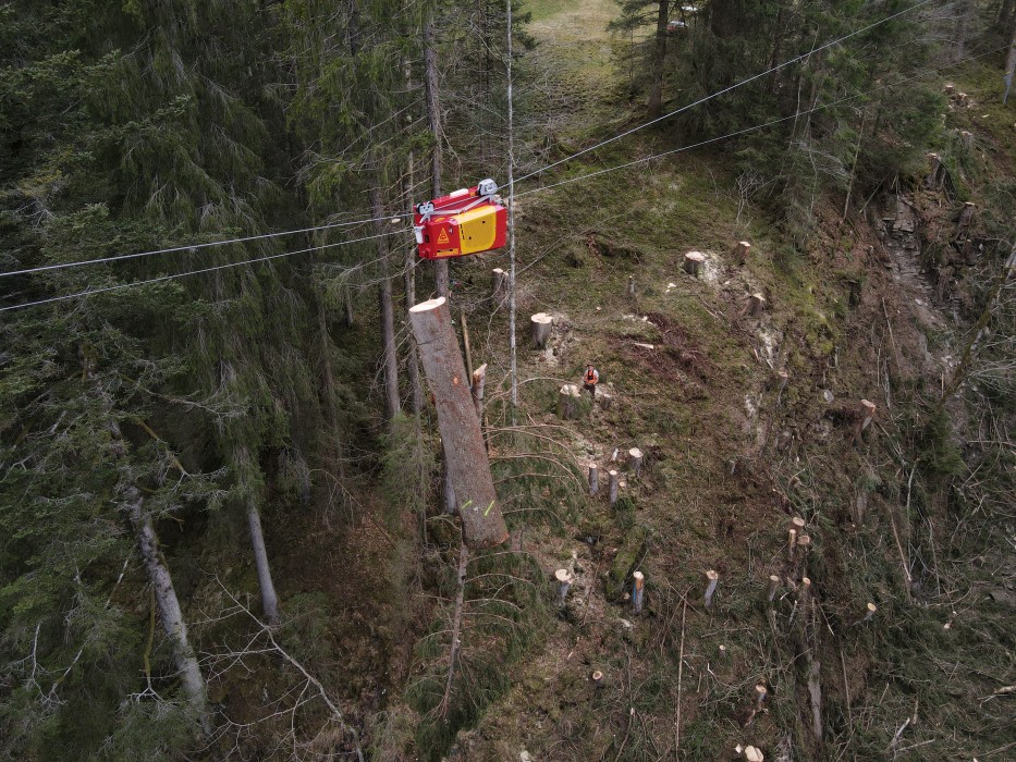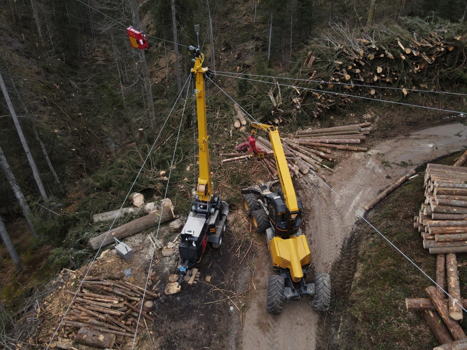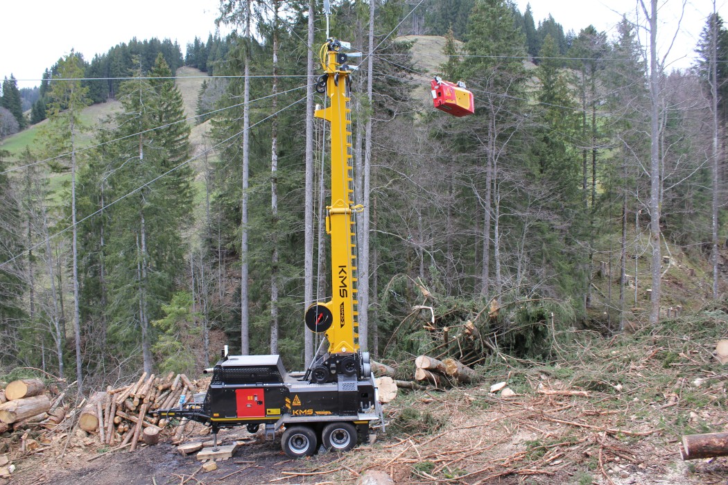 Inzwischen steht der Kippmast in vollem Einsatz und die Holzerntearbeiten können noch schneller und rationeller ausgeführt werden. Dies auch dank dem ebenfalls neuen Laufwagen Liftliner, welcher mit den Funktionen «Heben/Senken» und «Fahren» gleichzeitig arbeiten kann. Denn durch die separate Hubseilwinde wird das Zugseil und Umlaufseil am Laufwagen befestigt und hat somit nur die Aufgabe, den Laufwagen zu ziehen. Dadurch arbeitet der Laufwagen Liftliner LL40-1 praktisch ohne Zug- und Tragseilverschleiss und ein besonders schonendes und effizientes Arbeiten in der Durchforstung ist ebenso möglich wie eine punktgenaue Platzierung der Stämme an der Entladestelle.