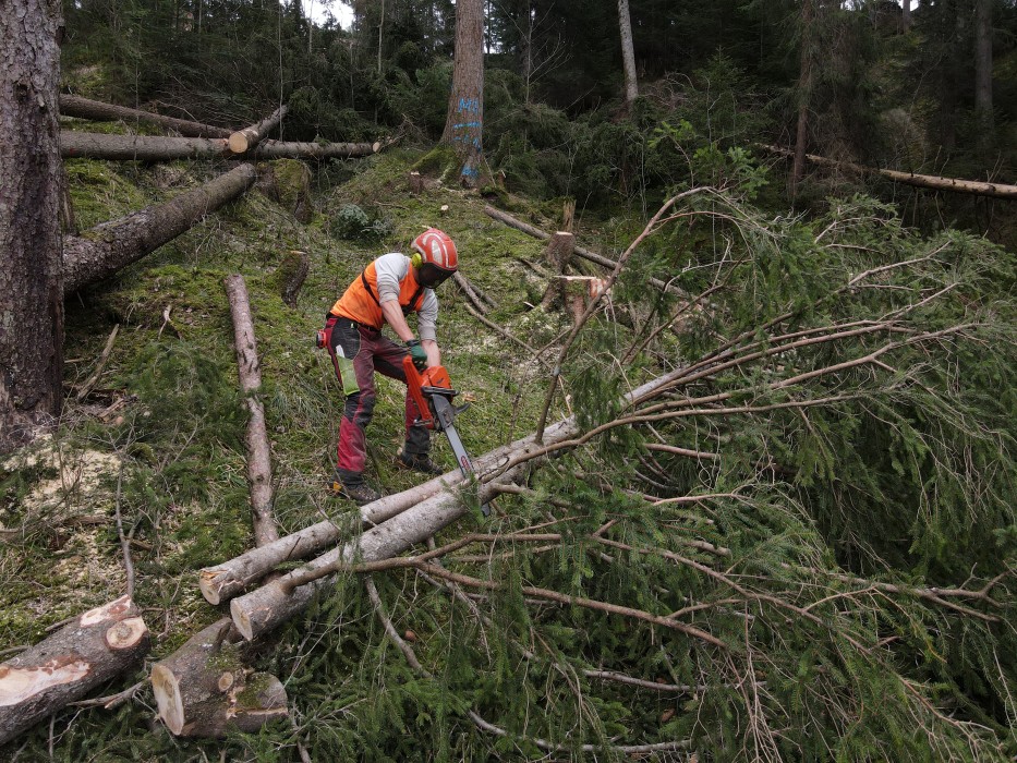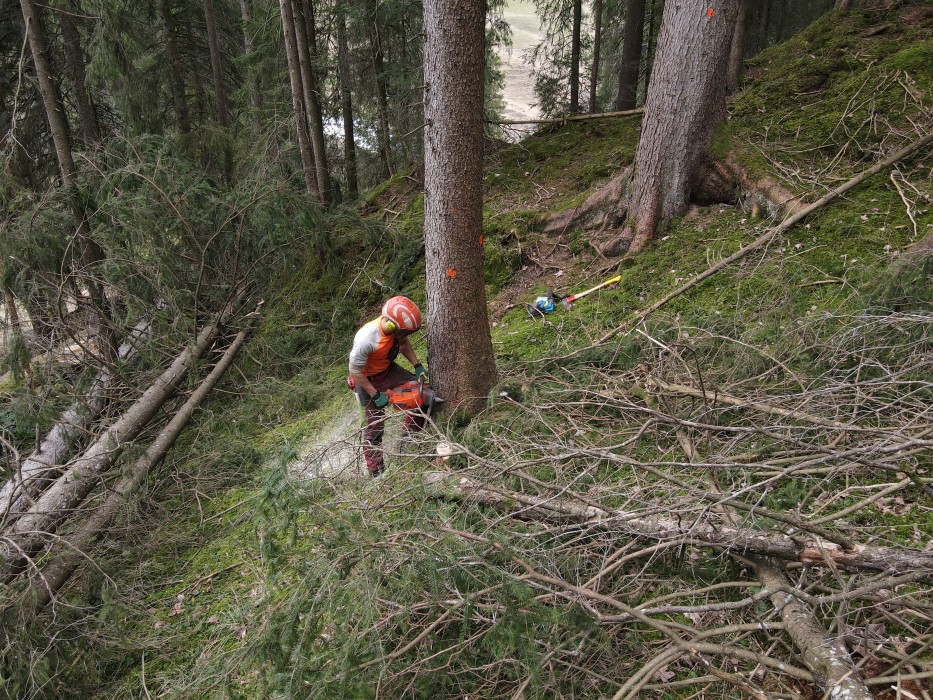 Nachdem die Seillinien ausgesteckt waren, konnten unsere motivierten Forstleute den Kippmasten gleich zusammen mit den Fachleuten der Firma KONRAD montieren und in Betrieb nehmen. So konnten Fragen zum Aufbau und zur Bedienung gleich vor Ort geklärt werden.